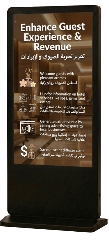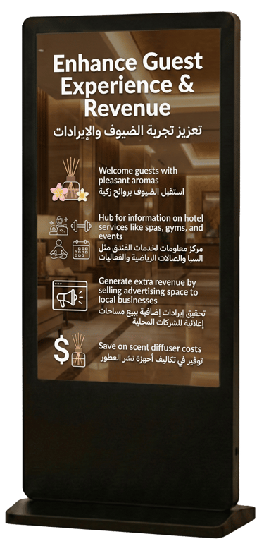 Welcome guests with pleasant aromas and provide a hub for information on hotel services like spas, gyms, and events. Generate extra revenue by selling advertising space to local businesses, all while saving on scent diffuser costs.